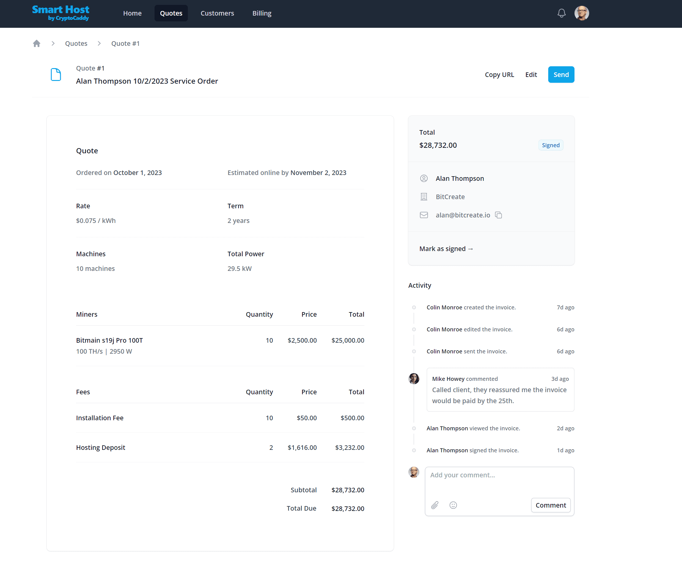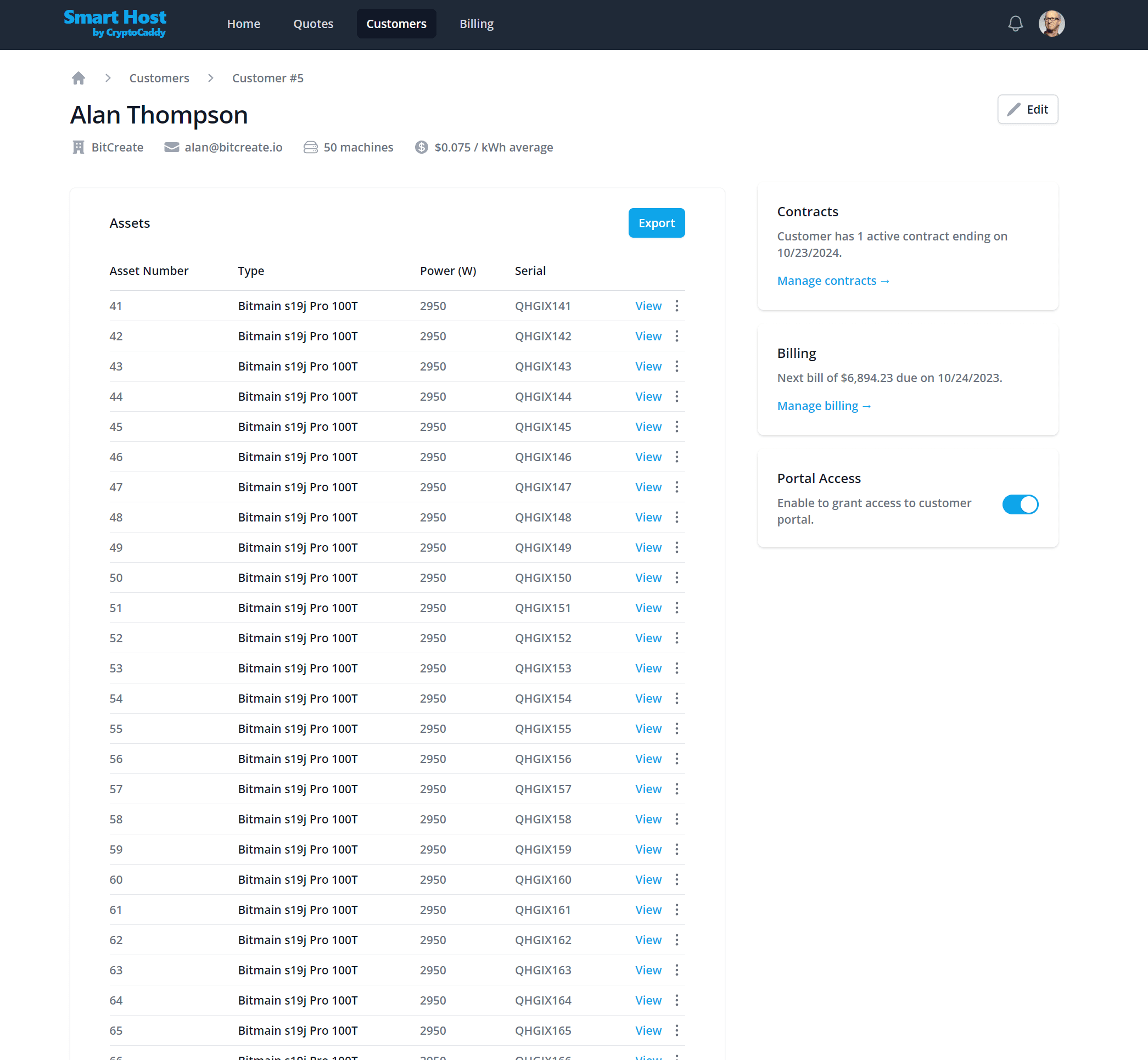 - Quickly and easily create new hosting quotes, and select from a pre-populated database of ASICs. Let Smart Host do all of the math around power usage and deposits.